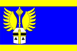 Description: three horizontal stripes of yellow and blue, proportioned 1:6:1; at the hoist a white knight's helmet with a standing sceptre on top, between two wings, all yellow.