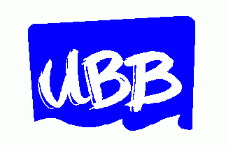 The flag s white with a blue logo, in a rounded blue rectangle with wavy base line are white initials "UBB".