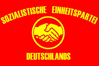 A red flag with the party emblem (a white disk with at the center a red flag with clasped hands, around the edge a blue yellow-bordered circle with the letters SOZIALISTISCHE EINHEITSPARTEI DEUTSCHLANDS in yellow) at the center. Ratio 3:5. Illustrated in Oliver