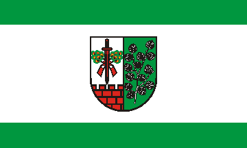 It is a green-white-green vertical triband with ratio of stripes 1:3:1. The arms are shifted to the top.
