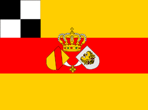 A yellow-red-yellow triband. On red stripe, slightly to the left and rotated 45 degrees, the lesser arms of Baden, slightly to the right and rotated 315 degrees, the lesser arms of Prussia, slightly above the center and overlapping top stripe, a royal crown. A square canton with height filling yellow stripe: quarterly black-white. Abolished 1918.