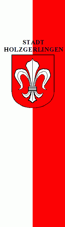 It is a white - red vertical bicolour. The coat of arms is shifted to the top. Above the arms is a black, centred inscription "STADT"(1st line) "HOLZGERLINGEN"(2nd line).