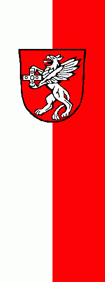It is a white-red vertical bicolour. The coat of arms is shifted to the top.