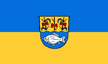 It is a green flag with two horizontal yellow stripes. The coat of arms is in the middle of the flag between the stripes.