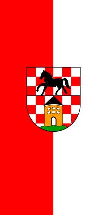 It is a red-white-red vertical triband with ratio of stripes 1:8:1 and arms shifted to top on the white stripe. Under the shield is a black inscription "KRÖV"