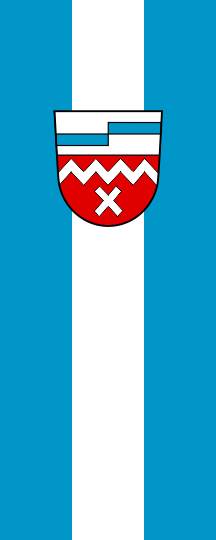 It is a blue-white-blue vertical triband. The coat of arms is shifted towards the top.
