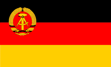 This flag was adopted on 1 Oct 1959, and continued in use as the flag of East Germany until the reunification of the Germanies on 3 Oct 1990 - one year after the fall of the Berlin Wall. Ratio 3:5. The coat of arms shows a hammer and compass in a ring of rye, symbolising the working class, intelligentsia, and farmers.