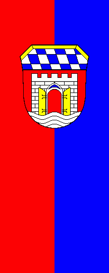It is a red-blue vertical bicolour. The coat of arms is shifted towards the top, either on a Renaissance shield (see left image above) or on a Spanish shield (see right image above).