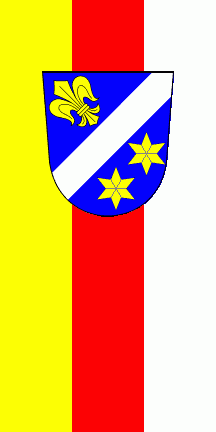 It is a yellow - white - blue vertical tricolour. The coat of arms is shifted to the top.