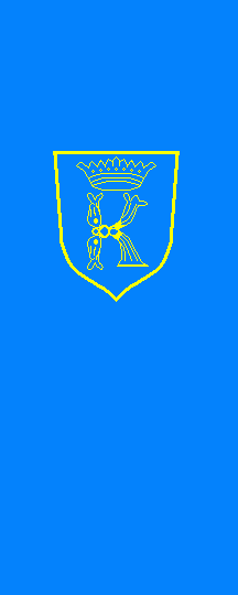 It is a blue vertical monocolour. The coat of arms is shifted to the top.