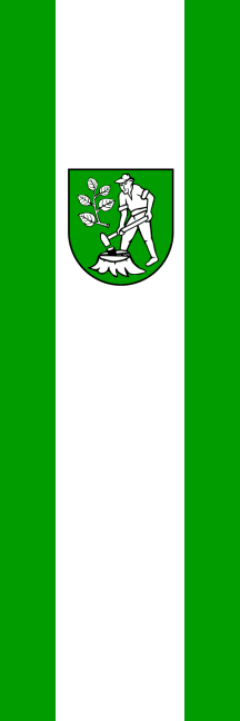 The shield is green, displaying a lumberman, cleaving a stomp with a hammer and a black wedge, all other charges are silver. Above right is a silver branch of beech having five leaves.