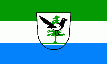 Shield Argent with base Azure cotised white and green, issuant from base a pine Vert, superimposed by a sinister facing magpie statant proper.