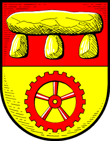 Shield parted per fess, above Gules a dolmen Or, beneath Or a cogwheel Gules.