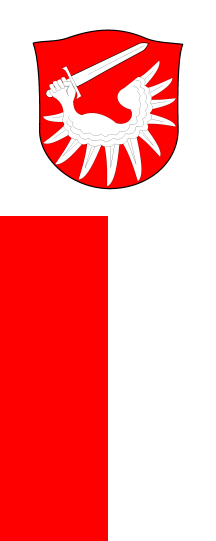It is a red-white vertical bicolour. The coat of arms is in a white bannerhead.