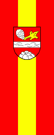 It is a red-yellow-red vertical triband with ratio of stripes 1:1:1. The coat of arms is shifted towards the top.