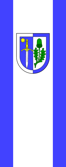 It is a blue-white-blue vertical triband with ratio of stripes 1:3:1. The coat of arms is in the white stripe and shifted towards the top.