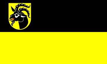 It is a black over yellow horizontal bicolour. The coat of arms is in the canton.