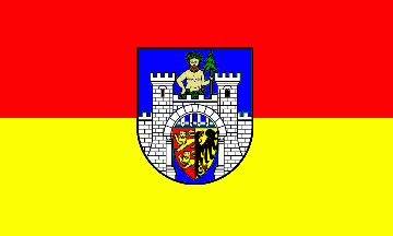 It is a red over yellow horizontal bicolour with centred arms.