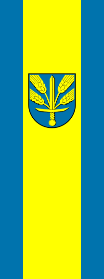 It is a blue-yellow-blue vertical triband with ratio of stripes approx. 3:7:3. The coat of arms is in the yellow stripe and shifted to the top.