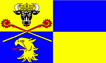 The flags ratio is 3:5. The flag is quarterly divided into yellow (upper hoist and lower fly) and blue (lower hoist and upper fly). Both hoist quarters together shows the new coat of arms without shield.