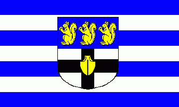 The silver (= white) field is divided by a black centred cross, which is in the centre superimposed by a golden (= yellow) plough share. In the blue chief are three golden (=yellow) squirrels, holding nuts between their paws, ordered horizontally.