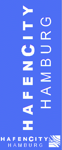 The blue banner of the new borough of Hafencity can be found everywhere in the new borough. The ratio is approx 5:2. The banner is blue with white, vertical inscriptions in capitals spreading out nearly all over the flag. The inscription is "HAFENCITY(bold, 1st column, with bigger "C") HAMBURG (2nd column). At the bottom edge the same inscription is placed horizontally and much smaller besides a square logo. The square is blue with two white waves dispersing from the upper right and the lower left corner of the square, both interfering in its centre.