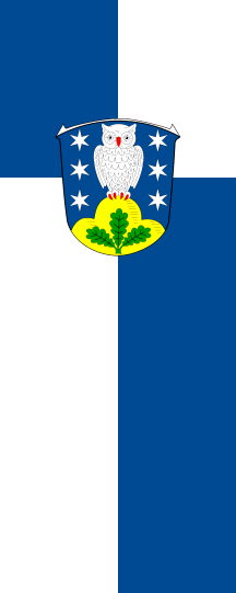 The banner is off-centred quartered of blue and white. The coat of arms is on the common point of all quarters.