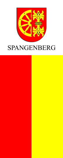 It is a red-yellow vertical bicolour. The coat of arms is in a white bannerhead. Beneath the shield is an inscription in black capitals "SPANGENBERG".