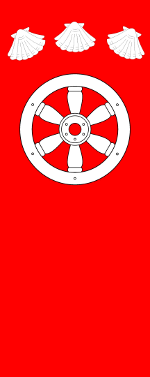 Shield Gules, a 6-spokes wheel Argent, in chief three scallops Argent ordered alongside an invisible bow.