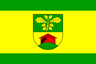 It is a yellow-green-yellow vertical triband with ratio of stripes approx. 2:7:2 and arms shifted to top in the central stripe.