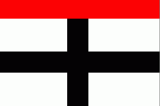 The white flag is divided by a black off-centred cross shifted to the top. At the top is a red stripe.