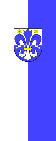 It is a white-blue vertical bicolour. The coat of arms is shifted towards the top.