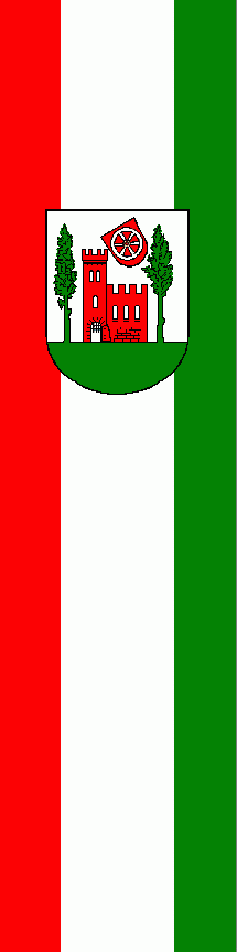 It is a red - white - green vertical tricolour. The white stripe is broader. The coat of arms is shifted to the top. Please note that the image within in source is an old B/W photo. Thus I chose the pattern as given by Stadler, which has only slightly changed (double row of pinnacles, different number of windows).