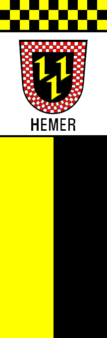 The former commune Hemer used a banner with rows of alternating black and yellow squares in the top, the arms and the lettering 'Hemer' below these rows, and yellow and black stripes in the bottom. The flag was apparently not formally approved: Hostert 1979 says that it was used at least since 1960/61, but it is already mentioned in