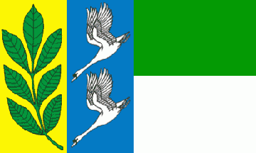 It is a green over white horizontal bicolour. The flaghead displays the arms without shield.