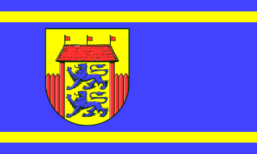 The ratio is 3:5. It is a blue flag. The coat of arms is shifted to the hoist and between two narrow, horizontal, yellow stripes of full width.