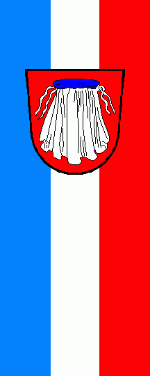 It is a blue-white-red vertical tricolour. The coat of arms is shifted towards the top.