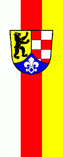 It is a white-red-yellow vertical tricolour. The coat of arms is shifted to the top.