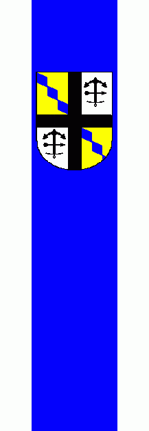 It is a white - blue - white vertical triband with ratio 1:3:1. The coat of arms is shifted to the top.