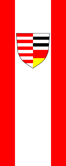 It is a red-white-red vertical 3-stripes banner with ratio approx. 3:7:3. The coat of arms is shifted to the top within the white stripe.