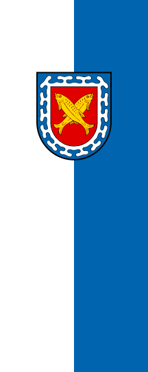 It is a white-blue vertical bicolour. The coat of arms is shifted to the top.