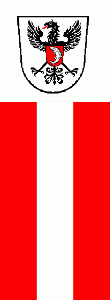 It is a red - white - red vertical triband. The coat of arms is in the centre of a white bannerhead.