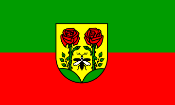 It is a green-red vertical bicolour. The coat of arms is shifted to the top. Above the shield is a white scroll with inscription in black serifed initials "ROSENTHAL".