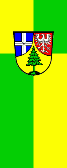 The banner is off-centred quartered of yellow and green with arms shifted to top (see left image above) or a green-yellow vertical bicolour with arms on a bannerhead with counterchanged stripes (see right image above).
