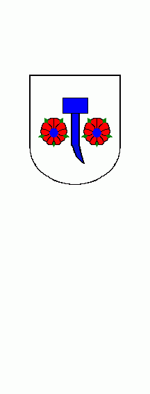 In a silver (= white) shield is a blue lynchpin, flanked by two red, heraldic roses, barbed green and seeded blue.