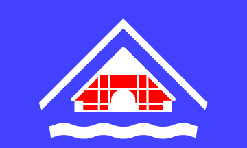It is a white flag. Between a blue fess wavy (below) and a blue chevron (above), continued by blue bars, is the gable side of a red house.