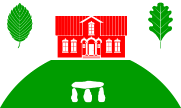 The ratio is 3:5. It is a green over white over green horizontal bicolour with ratio 1:4:1. The municipal coat of arms is in the centre of the white stripe.