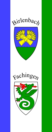 It is a blue-white-green vertical tricolour with ratio of stripes 1:3:1. The white stripe is charged with the arms of Birlenbach above and those of Fachingen below. Above from both shield is a black embowed inscription, writing the names.