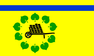 It is a yellow flag divided near the top by a blue, horizontal line. Beneath the line and shifted to the hoist is a black wheelbarrow, loaded by bricks of peat. The wheelbarrow is surrounded by a circle of ten green linden leaves.