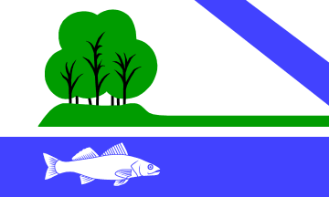 The sheet is horizontally divided into white over blue with ratio approx. 2:1. At the hoist side on the blue stripe is a white, sinister facing pikeperch. Shifted to the hoist on the white stripe is a green hill crowned by three trees in natural colour, i.e. green leaves and black stems. The hill is continued by a green, horizontal line reaching the flyend. The upper fly corner is divided by a blue, bendy line.